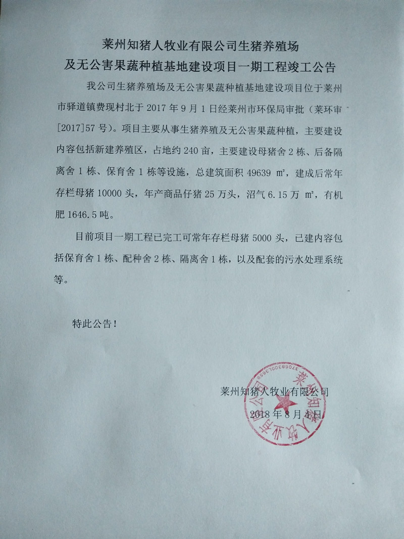 莱州知猪人牧业有限公司生猪养殖场 及无公害果蔬种植基地建设项目一期工程竣工公告